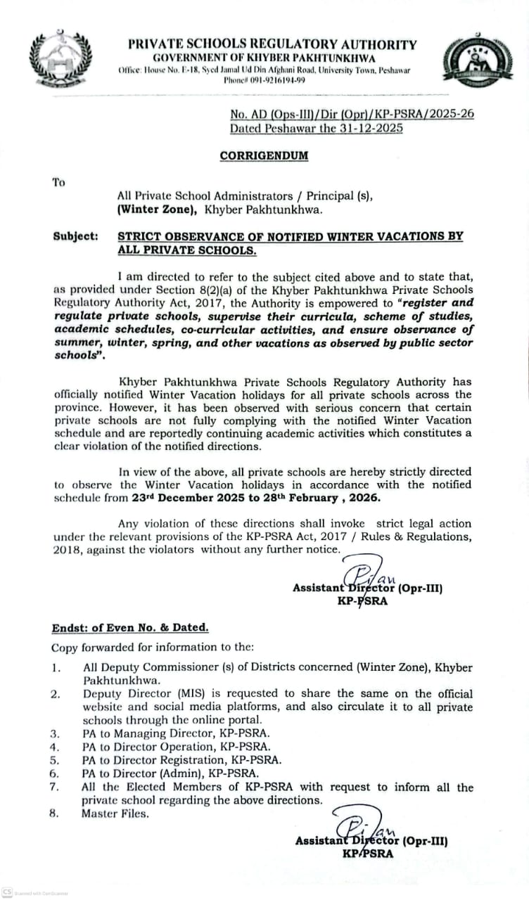 STRICT OBSERVANCE OF NOTIFIED WINTER VACATIONS BY ALL PRIVATE SCHOOLS