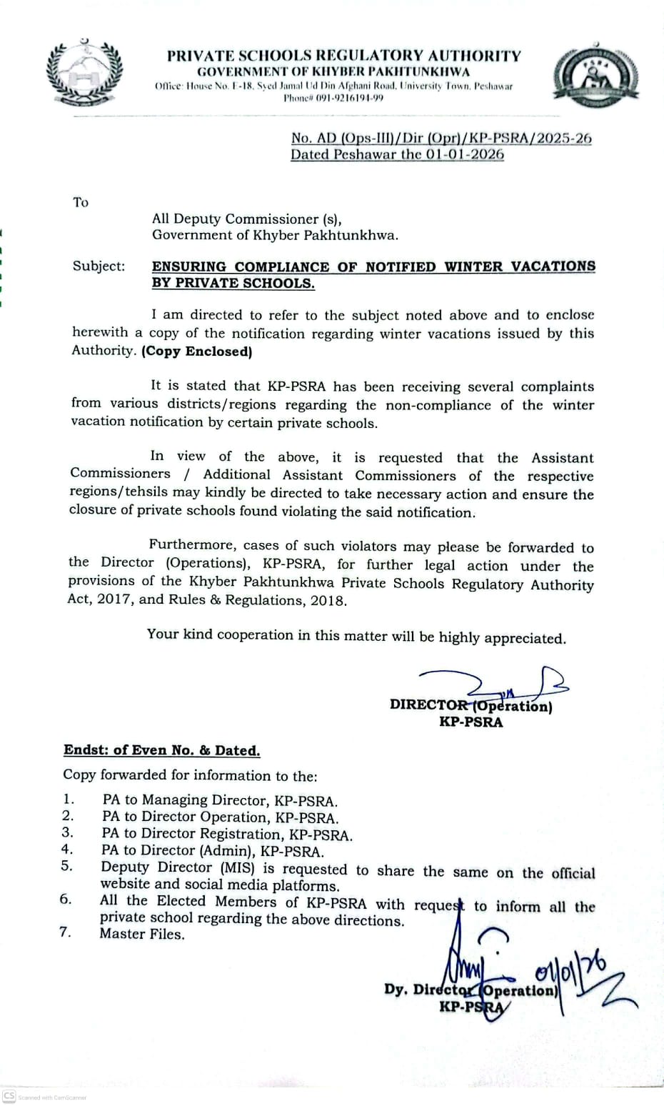 Ensuring Compliance of Notified Winter Vacations by Private Schools.